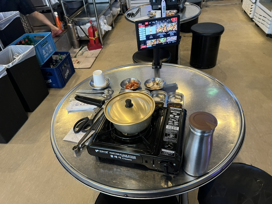 테블릿과 휴대용가스렌지, 오뎅탕, 밑반찬과 소스가